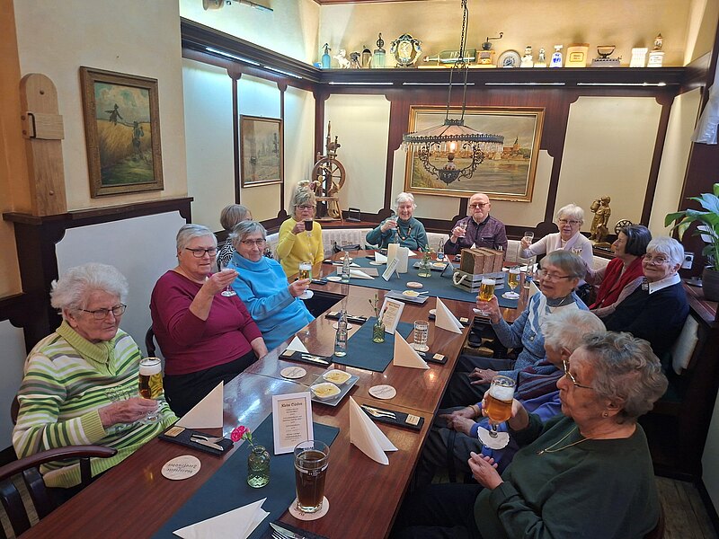 Mit insgesamt elf Tagesgästen besuchten wir erneut das Restaurant Stralsunder, in dem wir inzwischen beinahe schon als Stammgäste gelten dürften. Unsere Gruppe wurde herzlich begrüßt und konnte direkt an der bereits liebevoll gedeckten Tafel Platz nehmen. Schon kurz darauf wurden die ersten Getränkewünsche aufgenommen, bevor das festliche Eisbeinessen serviert wurde.